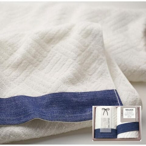 ■暮らしに寄り添い安らぎの時間を届ける安心の日本製タオル。デニムのようなネイビーの差し色がおしゃれで凹凸感のあるテキスタイルパターンで仕上げた爽やかなタオルは、コットンのシャリ感が心地よく乾きやすい毎日使いたいタオルです。