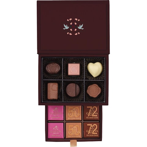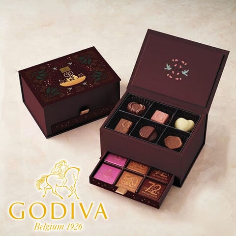 ■シャディ100周年限定パッケージ。リト@葉っぱ切り絵のアートを入れ込んだスペシャルな商品。ゴディバを代表するハートオブゴールドコレクションの中で愛され続けるチョコレートに人気のカレを加えて、特別なパッケージに詰め合わせました。