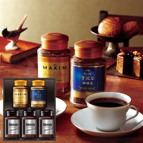 ■まずはストレートで楽しみたい「ちょっと贅沢な珈琲店」と「マキシム」や、ミルクをたっぷり入れて深いコクのカフェオレが楽しめる「ブレンディ」インスタントコーヒーの詰め合わせです。気分に合わせて色々な飲み方を楽しめるギフトセットです。