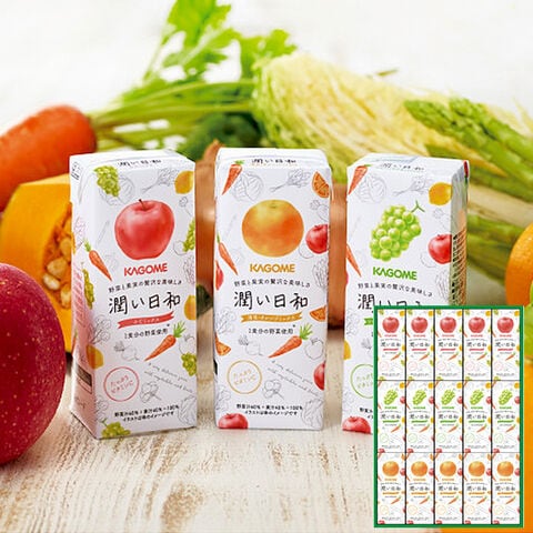 ■「潤い日和」ミックスふじミックス・清見オレンジミックス・シャインマスカットミックスの3種を詰め合わせたギフトです。1本(200ml)に1食分の野菜120g分を使用しながら、フルーティーで贅沢な美味しさをお楽しみいただけます。