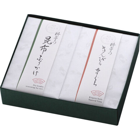 ■昆布ふりかけ、きんぴらまぐろの2種詰合せです。場面を選ばないすっきりとしたパッケージでご用意いたしました。