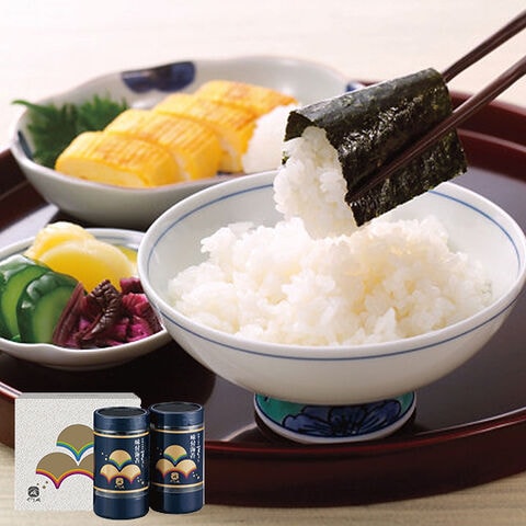 ■その年の最初に摘み採られた、口どけがよく、色艶、香りのよい初摘み海苔だけを使用。有機丸大豆醤油を使用したたれで大切に調味したコクと旨味のある味付海苔を卓上容器に入れ、贈答用にセットしました。
