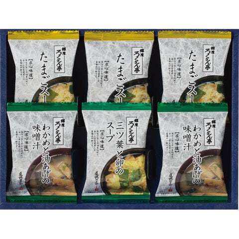 ●(フリーズドライ)たまごスープ6.5g×3、わかめと油あげの味噌汁8g×2、三ツ葉と卵のスープ5g×1(計6食)
