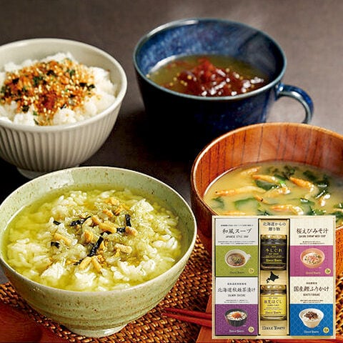 ●和風スープとろろ昆布・海藻(5.2g×3)、桜えびのみそ汁(8.3g×3)、北海道秋鮭茶漬け(7.5g×3)、国産鰹ふりかけ(3g×4)、北海道牛しぐれ(90g)・北海道秋鮭荒ほぐし(70g)