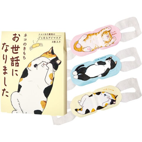 ■あったか心地よい蒸気で目と目元をじんわり温め、気分もほぐれるアロマタイプの温熱アイマスク。仕事やゲームなどでPC・スマホを使いすぎた時に。ほっとひと息つきたい時に。完全くつろぎモードのねこたちと一緒に、ぐぅたら気分でリラックスタイムを。