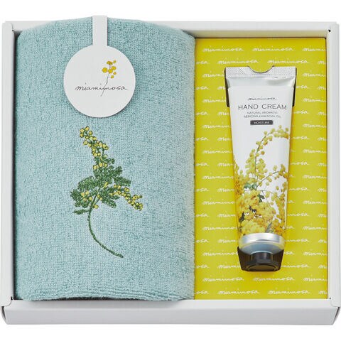 ■春を告げる花ミモザをモチーフとした今治タオルと、天然香料ミモザ精油がふんわりと柔らかく香る、するすると伸びる滑らかな使い心地のハンドクリームのセット。ハンドクリームはヘーゼルナッツオイルとアロエベラエキス配合でしっかり潤うのにべたつかず、やわらかな手肌へ導きます。