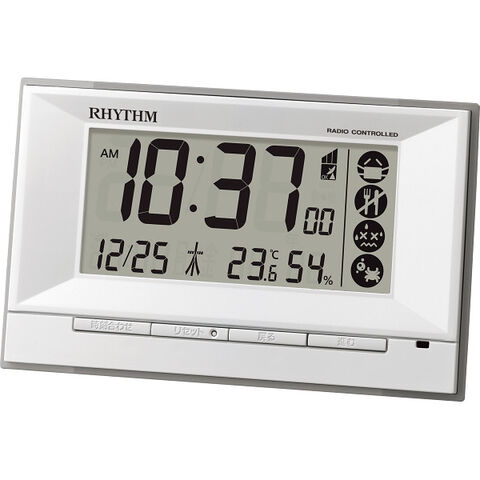 ■温度・湿度表示に加え4つのアイコンで環境目安表示する、使う人にやさしいデジタル電波時計です。お部屋の環境管理にぴったりな環境目安表示付デジタル電波目覚ましです。