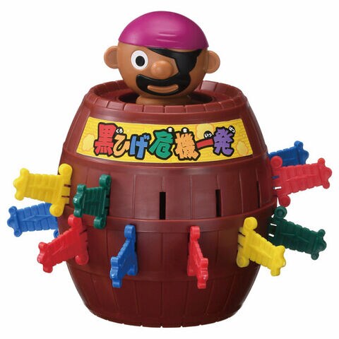 ■剣をさすたびハラハラドキドキ!いつ飛び出すか!?ドキドキワクワク!黒ひげ人形をタルから助け出そう!タルの中に黒ひげ人形をタルに押し入れてセットし、剣をタルの穴へ1人ずつ順番にさしていきます。黒ひげ人形が飛び出した人が勝ち!