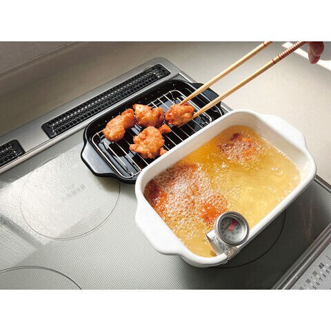 ■琺瑯素材の特性を活かしたコンパクトでスリムな四角い揚げ鍋。優れた熱効率でカラッと仕上がります。とんかつ・エビの天ぷら・アスパラガスなど長めの食材も揚げやすいサイズで、内面が色白で油の状態が一目でわかります。全面なめらかなガラス質で油汚れをすっきり洗い落とせます。フタ替わりになる揚げパット&揚げ網と、丸洗い可能な防水型温度計付き。ガス火・IH対応です。※フタ・本体は食洗器対応、揚げ網は食洗器不可