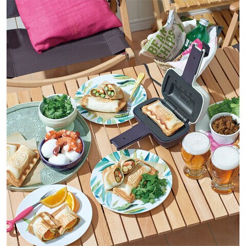 ■ちょうど良い食べきりサイズのホットサンドがカンタンに!一枚の食パンを折りたたんで作るハーフホットサンドができる電気ホットサンドメーカーです。