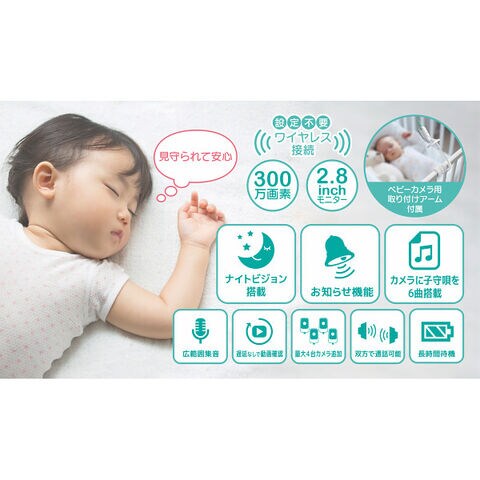 ●[ベビーモニター]画面表示=2.8型IPS液晶ディスプレイ・使用時間=約6時間・充電時間=約3時間・コード長約1m