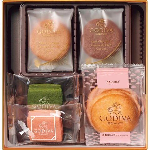 ■ゴディバで人気の焼き菓子「サブレショコラ」「ラングドシャクッキー」「ドームバームクーヘン」の3種を色とりどりにアソートしました。定番フレーバーと期間限定フレーバーいずれも楽しんでいただけるアソートメントです。全体に桜をあしらった春を感じるパッケージにアソートしました。