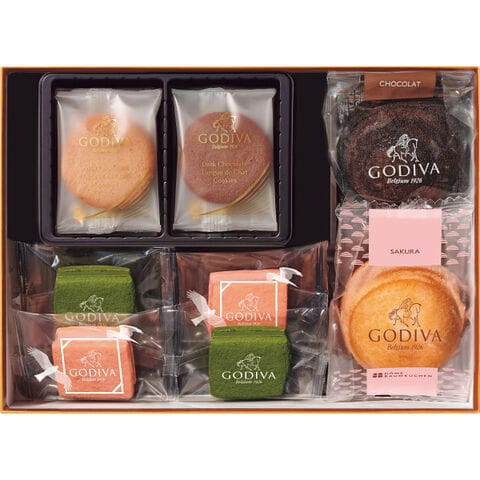 ■ゴディバで人気の焼き菓子「サブレショコラ」「ラングドシャクッキー」「ドームバームクーヘン」の3種を色とりどりにアソートしました。定番フレーバーと期間限定フレーバーいずれも楽しんでいただけるアソートメントです。全体に桜をあしらった春を感じるパッケージにアソートしました。