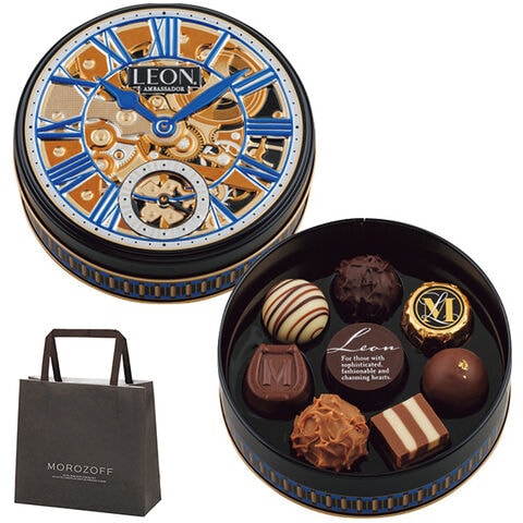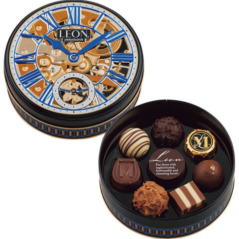 ■腕時計をかたどった缶は、レオンで一番人気のアイテム。2026年はローマ数字のインデックスが印象的な、スケルトン時計に。歯車などの内部機構を全面的に見せることで、上質な立体感と高級感を演出しています。風味豊かなトリュフや馬蹄型など8種のチョコレートを詰め合わせました。