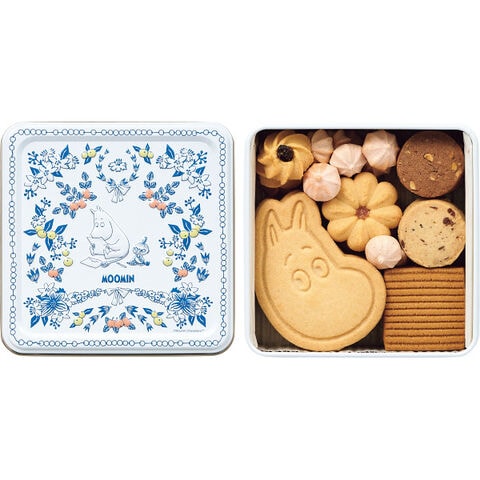 ■ムーミンとリトルミイの可愛らしいデザインにエンボス加工を施したクッキー缶。ムーミンのフェイス型クッキーとアソートクッキーを詰め合わせました。食べ終わった後は小物入れとしてもお使いいただけます。