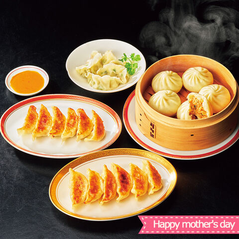 ●餃子16g(味噌だれ15g付) ×12、しょうが餃子16g(味噌だれ15g付) ×12、水餃子15g×12、水煎包25g×5