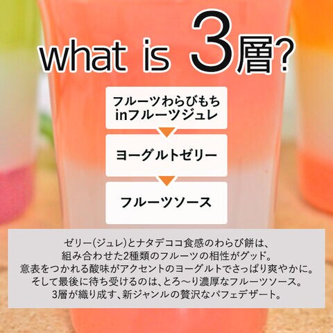 ■口どけの良いジュレともちもちのフルーツわらび餅。爽やかなヨーグルトゼリーを挟んで、最後にとろりとしたフルーツソース。食べ進めるごとに味わいと食感が変化する、贅沢な3層パフェデザート。