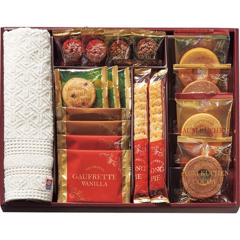 ●チョコチップクッキー×3・ロングスティックパイ×2・バウムクーヘン(ココア)×2・バウムクーヘン(バニラ)×2・ゴーフレット(チョコ)×2・ゴーフレット(バニラ)×2・チョコレートクランチ(ミルク)×2・チョコレートクランチ(ストロベリー)×2・ウォッシュタオル(約34×35cm・綿100%・日本製)×1●アレルゲン:卵 乳 小麦 大豆 アーモンド●原産国:日本●加工地:日本●化粧箱入●箱サイズ:38.9×29.6×4.3cm●箱重量:540.0g●宅配温度区分:常温●賞味期限:(製造より)約120日●JAN 4996971132696