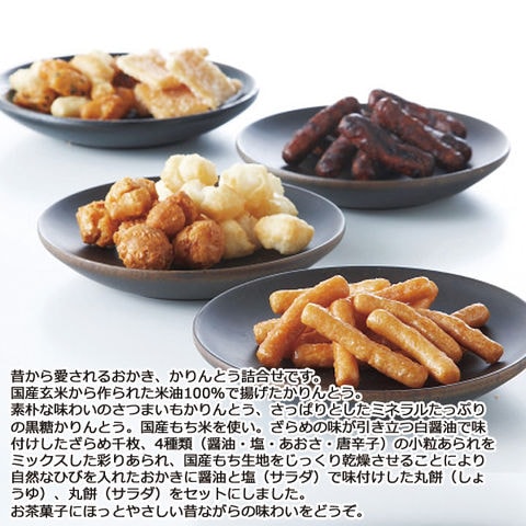 ●かりんとう(さつまいも)40g×4、かりんとう(黒糖)40g×4、ざらめ千枚40g×3、彩りあられ40g×3、丸餅(醤油)40g×3、丸餅(サラダ)40g×3