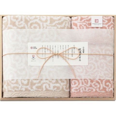 ■「今治謹製 紋織タオル」は木目も美しい木箱入りタオルです。箱を手に取った瞬間の木の温もりは感謝の気持ちをお伝えするタオルギフトに花を添えます。