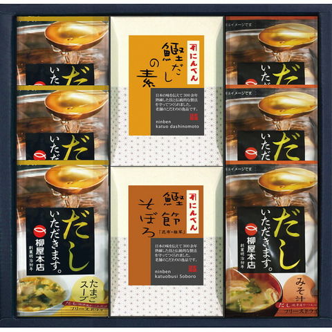 ●にんべん鰹節そぼろ(10g×3袋)×1、にんべん鰹だしの素(6g×8袋)×1、フリーズドライ味噌汁9.8g×3、フリーズドライ玉子スープ5.4g×3