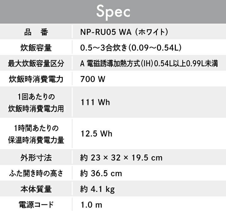 NPRU05 NP-RU05 3合 2合 1合 0.5合 うまみ圧力蒸らし 豪熱沸とう 豪熱沸騰 あったか再加熱 グレー液晶 タイマー 予約 お知らせメロディ 0.5カップごと 目盛り 黒まる厚釜 厚さ1.7mm 洗米OK内釜 洗える内ぶた 白米 おいしい ご飯 内釜 長時間 保温 高め保温 立つしゃもじ Ag+抗菌加工 プッシュボタン 抗菌 エコ炊飯 白米急速 熟成炊き 炊きこみ 炊きこみごはん 炊きこみご飯 炊き込みごはん 寿司飯 シャリ すしめし おかゆ おこわ 玄米 発芽玄米 麦ごはん お手入れ 電気釜 簡単 かんたん カンタン らくらく ラクラク デザイン スタイリッシュ かっこいい シンプル キッチン 台所 食事 食卓 毎日 日常 デイリー 普段使い 新生活 引越 引っ越し 買い替え 新調 家電 キッチン家電 社会人 大学生 一人暮らし 単身赴任 新築祝い 結婚祝い お祝い 白 WHT ホワイト家電 ホワイトコーディネート 白物家電 家電 キッチン家電 送料無料 ZOJIRUSHI zojirushi