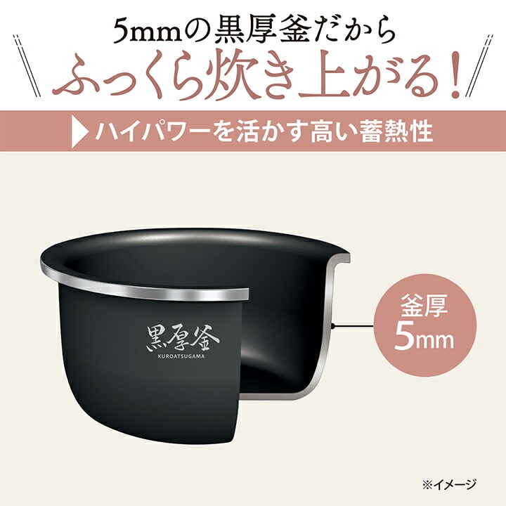 ●芯までふっくら炊き上がる熱が側面まで 伝わりやすい、広く浅めの形状「5mmの黒厚釜」 ●大火力で炊くからふっくらおいしい! ハイパワー「495W(最大電力)」+「全面加熱」 最大495Wの大火力と釜全体を包み込む全面加熱が、 芯までふっくら炊き上げます。蒸らしの時も釜底と上ふたのヒーターが、 ごはんのべちゃつきの原因となるつゆを抑え、しゃっきり炊き上げます。 ●24時間おいしく保温できる「うるつや保温」 底センサーが保温に最適な火加減で温度コントロールします。 水分の蒸発を抑え、24時間(※1)までおいしく保温します。 また、長時間の保温はしないが、よりあたたかいごはんを 食べたい方におすすめの「高め保温」メニューがあります。 ※1.メニューによって異なります。取扱説明書をご確認ください。 ●おいしく炊ける「無洗米」メニュー 水を加えるだけで炊飯できる無洗米専用のメニューです。 火力を高めた専用の炊き方で、ごはんの甘みを引き出します。 雑穀米、麦ごはんなど、多彩な炊き方に対応できます。 ●麦ごはんや雑穀米など、栄養たっぷりのお米もおいしく炊ける 「麦ごはん」メニュー 健康に気を遣う方に人気の「もち麦」や「押し麦」も風味を活かしながら ふっくらもちもちに炊き上げる専用のメニューがあります。 ●その他の特徴 ・芯までふっくらしたごはんが炊き上がる「豪熱沸とう」 ・ふきこぼれを抑える「大型蒸気口」 ・発酵から焼き上げまで手作りパンが楽しめる「パン(発酵・焼き)」メニュー ・炊きこみごはんの後など、ニオイが気になる時に便利な「クリーニング」機能 ・はずして洗えるディンプルアルミ遠赤内ぶた ・「立つしゃもじ」つき ・いつでも簡単に取扱説明書が確認できる2次元コードつき |