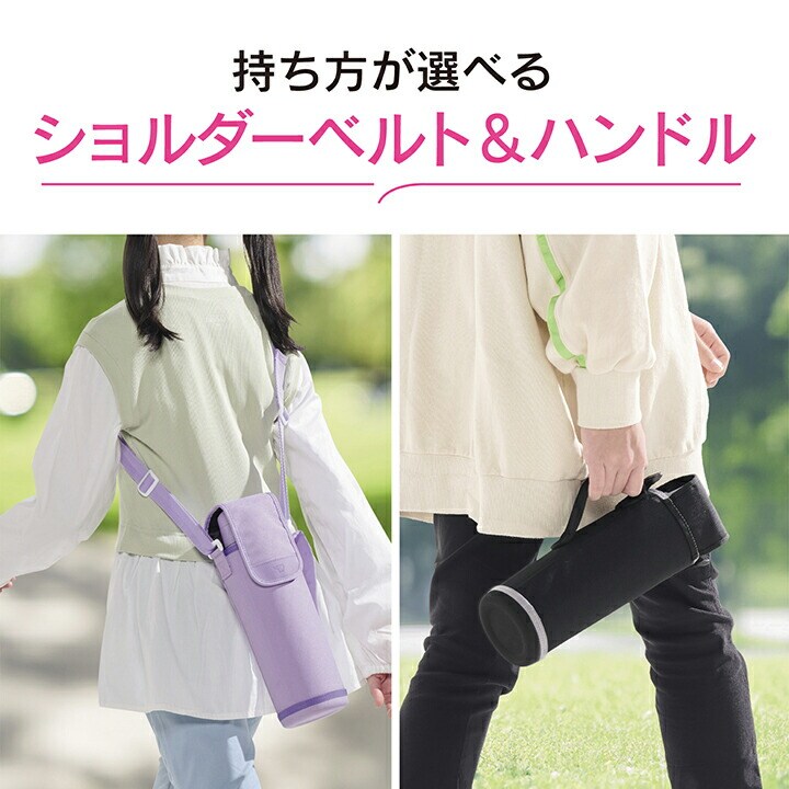 ●カバーに入れたままでも飲みやすいハンドルつき。 ●肩掛けでも手持ちでも。持ち方が選べる「ショルダーベルト&ハンドル」 ●洗濯機洗いOK!(※1) ●すぐ飲めて、ふたも保護してくれるオーバーフラップタイプ。 ●名前が書けるネームタグつき。(※2) ●本体を入れたままでも自立しやすい丈夫な底! |
