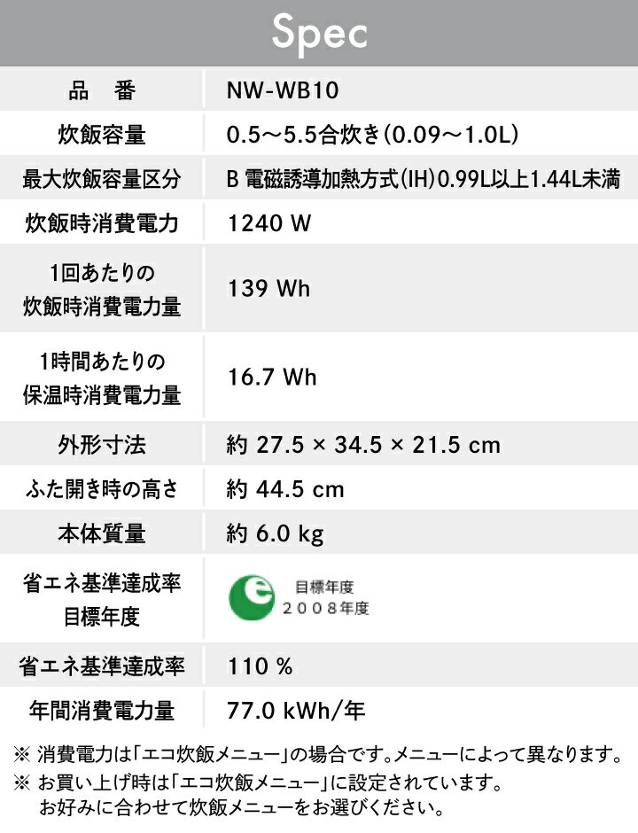 ●大火力でお米を炊き続ける「豪熱大火力」 大火力を加え続けることで、お米本来の甘みと粘りを引き出し 一粒一粒が際立つふっくらとしたごはんに。 ●「鉄-くろがね仕込み-豪炎かまど釜」 象印の最高級炊飯ジャー「炎舞炊き」と同じく、鉄を仕込んだ内釜※を採用。 IHと相性が良く発熱効率・蓄熱性が高い鉄素材を、熱伝導率の高い アルミ層と耐久性に優れたステンレス層に組み込み、 大火力を効率よくお米に伝えることで、おいしさを引き出します。 ※商品によって素材が一部異なります。 ●81通りの「わが家炊き」メニュー 前回食べたごはんの感想を回答するだけで、 炊き方を微調整し好みの食感に進化させます。 ●ごはんの食感を炊き分ける7通りの「炊き分けセレクト」 しゃっきりからもちもちまで、その日の献立や 家族の好みに合わせてごはんを炊き上げます。 ●白米の他、おかゆ・麦ごはん・雑穀米・玄米などに対応。 時間がない日もすぐに炊ける白米急速メニューや 解凍してもべたつきにくい冷凍ごはんメニューも。 ●お手入れ簡単! 毎回洗うのは内ぶたと内釜の2点のみ。内ぶたは食洗機OKです。 トップパネル・フレーム・庫内はサッと拭きやすいフラットタイプ。 ●40時間おいしく保温できる「極め保温」 ●消費電力を抑えられる「エコ炊飯メニュー」 ●環境に配慮したバイオマスプラスチック素材を採用した 立つしゃもじ&計量カップ付き。 |