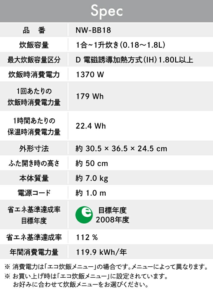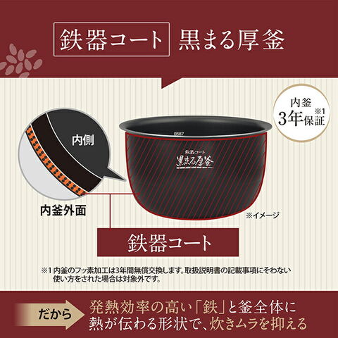 ●大火力で炊き続ける豪熱大火力シリーズ。 暮らしになじむスタイリッシュデザイン。 ●「鉄器コート黒まる厚釜」 釜全体に熱が伝わる形状に加え、IH加熱と相性の良く、 発熱効率の高い鉄を釜外面にコーティングし、炊きムラを抑えます。 ●49通りの「わが家炊き」メニュー 前回食べたごはんの感想を回答するだけで、 炊き方を微調整し好みの食感に進化させます。 ●ごはんの食感を炊き分ける7通りの「炊き分け圧力」 しゃっきりからもちもちまで、その日の献立や 家族の好みに合わせてごはんを炊き上げます。 ●食べやすく、おいしく炊ける「雑穀米炊き分け3コース」 ビタミン、ミネラル、食物繊維など様々な栄養素を とることができる雑穀米を3通りの食感に炊き分けます。 しゃっきり・ふつう・もちもちの3通りから選べます。 ●すごくお急ぎの方におすすめ「白米特急」メニュー 白米急速メニューより早い、約16分(1合で炊いた場合) で炊き上がるメニューです。 解凍してもふっくらおいしい冷凍ごはんメニューも。 ●40時間おいしく保温できる「極め保温」 ●環境に配慮したバイオマスプラスチック素材を採用した 立つしゃもじ&計量カップ付き。 |