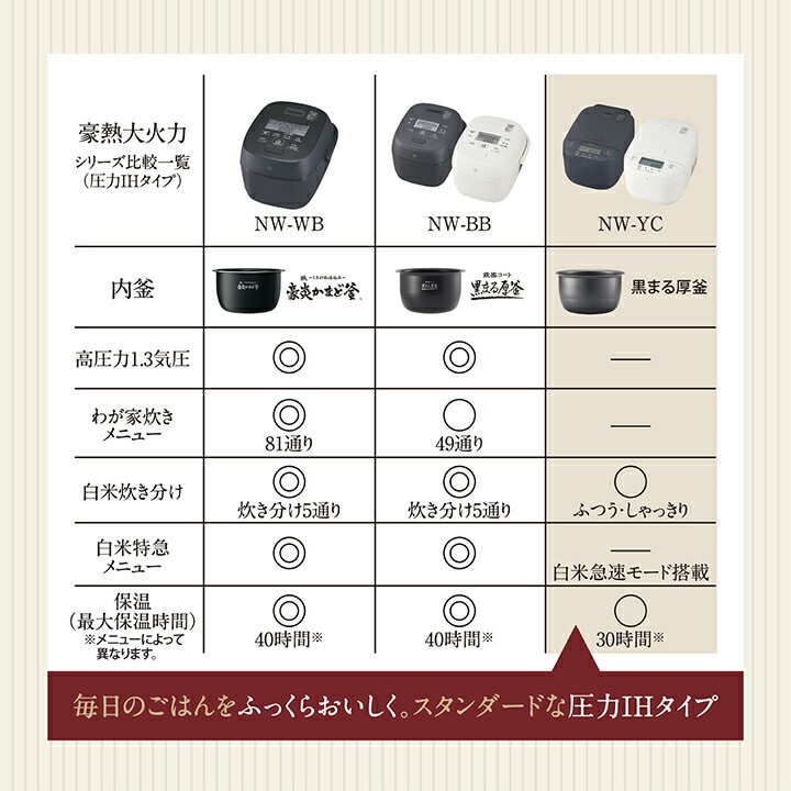 ●激しい対流がごはんの甘みを引き出す「豪熱大火力」 沸とう後も大火力を維持することで、お米の芯までしっかり熱を届けます。 ふっくらとした粒感と、甘みのあるごはんをお楽しみいただけます。 ●今日のごはんは、どの食感?選べる3通りの「炊き分け圧力」 圧力と時間を調整し、3通りの食感に炊き分け。 カレーに合う「しゃっきり」や手巻き寿司用の「すしめし」など、 お好みに合わせて選べます。 ●炊きあがりの、最後のひと押しが味の決め手「うまみ圧力蒸らし」 蒸らし工程の圧力でうまみを引き出し、さらに余分な水分を飛ばすことで、 しゃきっとふっくらしたごはんに仕上げます。 ●お手入れ簡単!毎回洗う点数はたったの2点だけ。 内ぶたは圧力ボールが無いので凹凸部分がより少なく、 本体もフラット構造なのでお手入れが簡単です。 ●30時間おいしく保温できる「うるつや保温」や 長時間保温しない方におすすめの「高め保温」メニューがあります。 ●環境に優しいバイオマスプラスチック素材を採用した 立つしゃもじ&計量カップ付き。 |