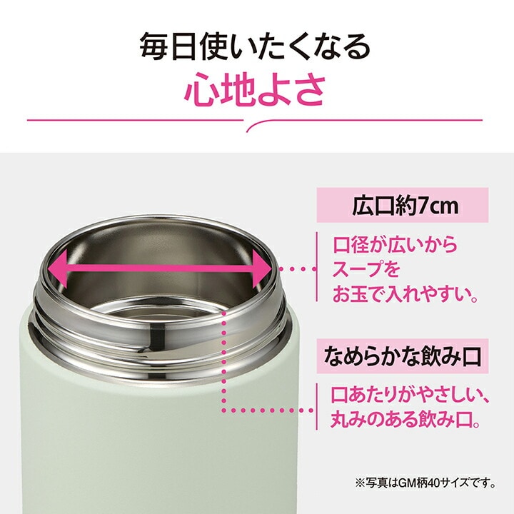 ●驚きの保温力でおいしさつづく! ・象印の独自技術、飲み口部分からの放熱を抑える 「サーモリング構造」で保温力がさらにアップ! ●保冷力もおまかせ! ・ステンレス真空2重のまほうびんで保冷力も高いから、 ひんやりメニューも楽しめます! ●毎日のお手入れがだんぜんラク! サッと洗えていつでも清潔に保てます。 ・全パーツ食洗機OK! ・パッキンを分解せずに洗える、 せんとパッキンがひとつになった「シームレスせん」。 ・本体内部は汚れが落ちやすく洗いやすい「ラクリア加工+(プラス)」。 ●広口約7cm! ・広めだからスープなどをお玉で入れやすく便利です。 ●なめらかな飲み口! ・口当たりがやさしく丸みがあります。 ●容量300ml ・スープや副菜に便利な汁椀サイズ。 |