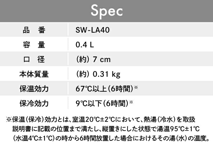 ●驚きの保温力でおいしさつづく! ・象印の独自技術、飲み口部分からの放熱を抑える 「サーモリング構造」で保温力がさらにアップ! ●保冷力もおまかせ! ・ステンレス真空2重のまほうびんで保冷力も高いから、 ひんやりメニューも楽しめます! ●毎日のお手入れがだんぜんラク! サッと洗えていつでも清潔に保てます。 ・全パーツ食洗機OK! ・パッキンを分解せずに洗える、 せんとパッキンがひとつになった「シームレスせん」。 ・本体内部は汚れが落ちやすく洗いやすい「ラクリア加工+(プラス)」。 ●広口約7cm! ・広めだからスープなどをお玉で入れやすく便利です。 ●なめらかな飲み口! ・口当たりがやさしく丸みがあります。 ●容量400ml ・大きめ具材のスープなどに便利な茶碗サイズ。 |