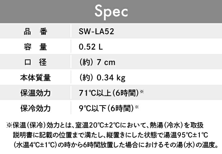 ●驚きの保温力でおいしさつづく! ・象印の独自技術、飲み口部分からの放熱を抑える 「サーモリング構造」で保温力がさらにアップ! ●保冷力もおまかせ! ・ステンレス真空2重のまほうびんで保冷力も高いから、 ひんやりメニューも楽しめます! ●毎日のお手入れがだんぜんラク! サッと洗えていつでも清潔に保てます。 ・全パーツ食洗機OK! ・パッキンを分解せずに洗える、 せんとパッキンがひとつになった「シームレスせん」。 ・本体内部は汚れが落ちやすく洗いやすい「ラクリア加工+(プラス)」。 ●広口約7cm! ・広めだからスープなどをお玉で入れやすく便利です。 ●なめらかな飲み口! ・口当たりがやさしく丸みがあります。 ●容量520ml ・カレーなどのメイン料理に便利などんぶりサイズ。 |