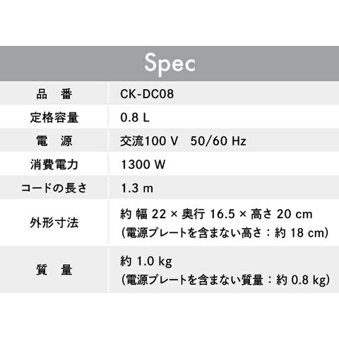 ●6つの安全設計! ・転倒湯もれ防止構造 ・本体二重構造 ・自動電源オフ ・空だき防止 ・給湯ロックボタン ・蒸気セーブ構造 ●清潔! ・ロックボタンと連動して注ぎ口が開閉する ほこりの入りにくい「注ぎ口ほこりブロック」 ●必要な分だけすぐに沸く! ・「ハイパワー1300W」でカップ1杯(140mL)約60秒 ●ひと目でお湯の量を確認できる「見やすい水量窓」 ●流線がなめらかで注ぎやすい「なめらか注ぎ口」 ●スムーズに取りはずせて給水もお手入れも楽な 「軽くはずせるふた」 ●持ちやすい形状のハンドル ●湯沸かし中が一目でわかる「湯沸かしランプ」 ●取り扱い説明書が確認できる二次元コードつき |