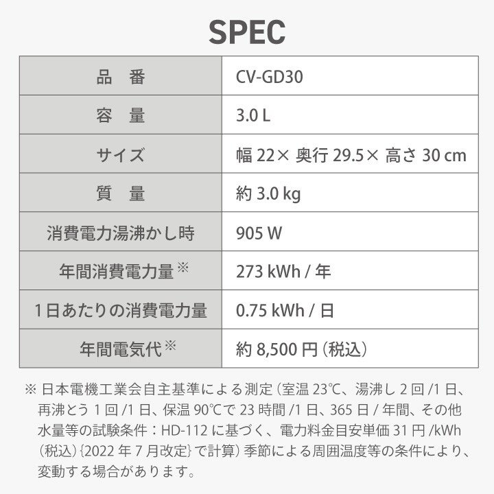 ●電気で沸かして「まほうびん保温」 電気とまほうびん構造を組み合わせてかしこく保温することで、 消費電力量を抑えます。 ●905W「スピード沸とう」 お湯が早く沸くから、時短にぴったり。 忙しい朝や料理の下ごしらえにも便利です。 ●大きな文字と分かりやすい操作パネル&大型グレー液晶 操作パネルの文字が大きく、視認性が高いボタン配置と配色で 使いやすさに配慮しています。 給湯ボタンは押しやすいセンターレイアウトです。 また、キッチンになじんで見やすい大型グレー液晶を採用しています。 ●湯沸かし時間、消費電力量、蒸気を抑える「沸とうセーブ」も選択可能! 沸とうさせずに設定した温度(90℃・80℃・70℃)まで沸かして保温するから、 湯沸かし時間、消費電力量、蒸気の発生を抑えられます。 (浄水器などの使用で、カルキとばしの必要がない方におすすめの機能です。) ●2時間操作しないと保温ヒーターを自動オフ「省エネモード」 (98℃・90℃・80℃保温設定時に選択可能) 2時間操作がないときは自動で保温ヒーターへの通電を切り、 消費電力量を削減します。 約70℃まで湯温が下がると70℃保温を開始します。 ●ゆっくり少量ずつ注げる「ゆっくりカフェドリップ給湯」 少量でゆっくり注げるのでお湯が飛び散りにくく、じっくり蒸らせます。 【その他の機能】 ・用途に合わせて使い分けられる「5段階保温設定」 (98℃・90℃・80℃・70℃・まほうびん) ・使わない時はタイマーで節約「5段階節約タイマー」 (6・7・8・9・10時間) ・お湯の残量がとっても見やすい「ワイドウインドウ」&「ピタッと赤玉水量計」 ・必要量を湯沸かしするのに便利「内容器水量目盛」 ・取扱説明書が確認できる二次元コードつき ・マイコン空だき防止 (ヒーター自動オフ) ・傾斜湯もれ防止構造、転倒湯もれ防止構造 ・自動給湯ロック ・クエン酸洗浄コース(3秒押し) ・フッ素加工内容器 ・お知らせメロディー ・カルキとばし沸とう ・センター給湯ボタン ・広口容器 |