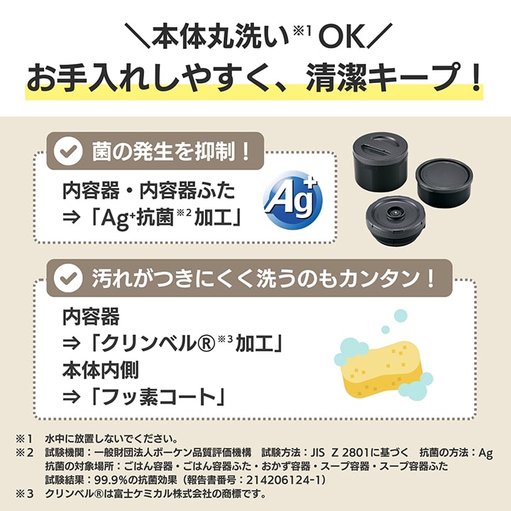 ・ごはんもおかずも「大盛りサイズ」 ・清潔!「Ag+抗菌加工内容器」 (ごはん容器・ごはん容器ふた・おかず容器 スープ容器・スープ容器ふた) ・「電子レンジ対応」 (ごはん容器・おかず容器・スープ容器) ・お手入れしやすく、いつでも清潔キープ! 「クリンベル®加工内容器(ごはん容器・おかず容器・スープ容器)」 「内面フッ素コート」「本体丸洗いOK」 ・「丈夫なステンレスボディ」 ・「はし」&「はし箱」つき |