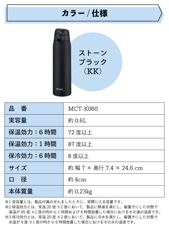 タイガー 抗菌ボトル MCT-K060 KK ストーンブラック 600ml 水筒 ワンタッチ 子供 夢重力 真空断熱 ボトル マグボトル ダイレクト 保温 保冷 抗菌 おしゃれ