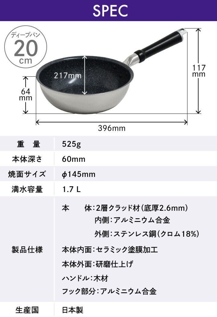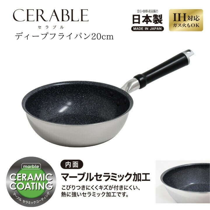 深型フライパン 深め 深い ウォックパン 取っ手付き 取っ手 ガス火 コンロ ガスコンロ 直火 IH ih IH 電磁調理器 ラジエントヒーター シーズヒーター ハロゲンヒーター プレートヒーター オール熱源対応 スピード加熱 家庭 家庭用 手軽 キッチン 台所 調理 料理 炊事 食事 食卓 キッチングッズ キッチン用品 キッチン雑貨 2層 アルミ アルミニウム ステンレス 木 木製ハンドル セラミック マーブルセラミック加工 セラミック加工 焦げ付きにくい 焦げつきにくい 傷が付きにくい 傷がつきにくい 熱に強い 軽い 軽量 日本 国産 made in japan JAPAN UMIC ウルシヤマ ウルシヤマ金属工業 漆山 漆山金属 漆山金属工業 送料無料 CERABLE シルバー ブラック 黒 20センチ 20センチ 20cm サイズ 小さ目 小さめ 小さい