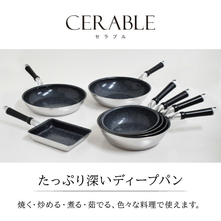 ●多用途で使える深型設計の日本製セラミックフライパン、 「セラブル」シリーズ! ●優れた熱伝導性。 ●軽量化で使いやすい。 ●高い耐久性。 ●Ihとの相性が良く、スピード加熱。 ●内面はこびりつきにくく傷が付きにくい、熱にも強いセラミック加工。 |