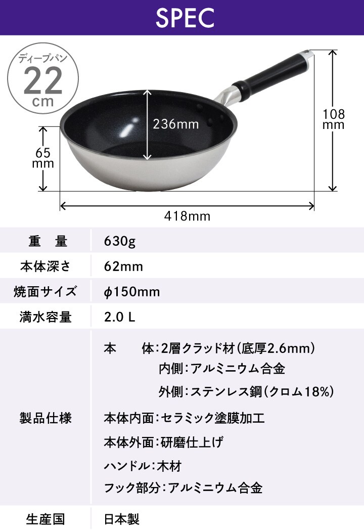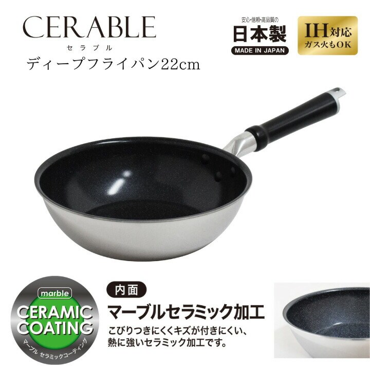 深型フライパン 深め 深い ウォックパン 取っ手付き 取っ手 ガス火 コンロ ガスコンロ 直火 IH ih IH 電磁調理器 ラジエントヒーター シーズヒーター ハロゲンヒーター プレートヒーター オール熱源対応 スピード加熱 家庭 家庭用 手軽 キッチン 台所 調理 料理 炊事 食事 食卓 キッチングッズ キッチン用品 キッチン雑貨 2層 アルミ アルミニウム ステンレス 木 木製ハンドル セラミック マーブルセラミック加工 セラミック加工 焦げ付きにくい 焦げつきにくい 傷が付きにくい 傷がつきにくい 熱に強い 軽い 軽量 日本 国産 made in japan JAPAN UMIC ウルシヤマ ウルシヤマ金属工業 漆山 漆山金属 漆山金属工業 送料無料 CERABLE シルバー ブラック 黒 22センチ 22センチ 22cm サイズ 小さ目 小さめ 小さい