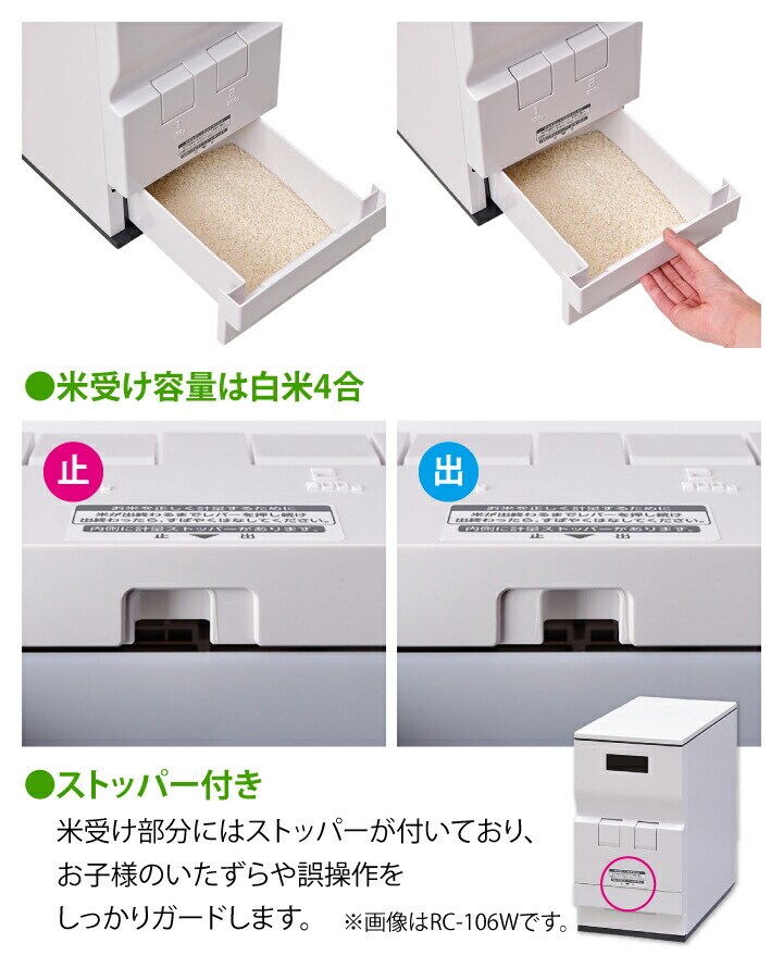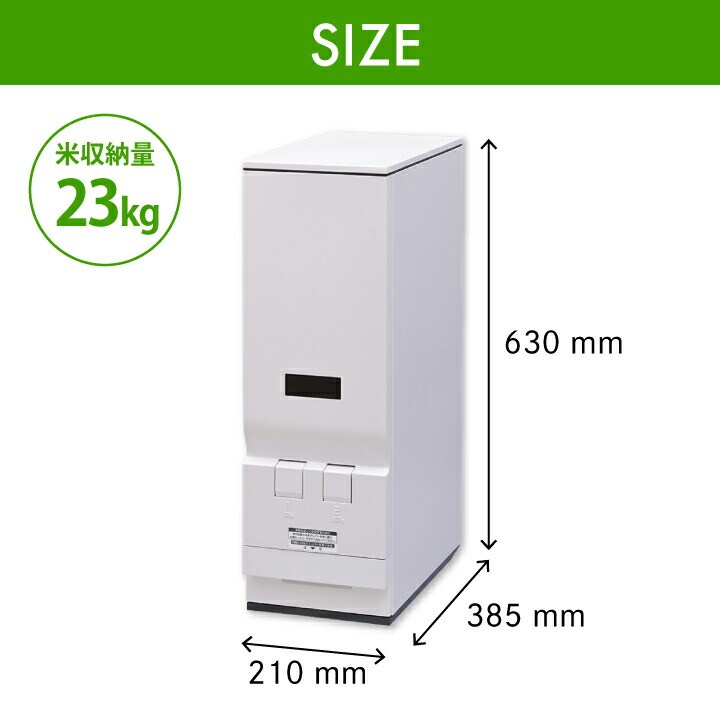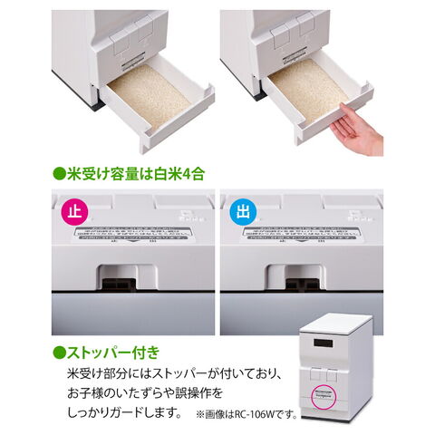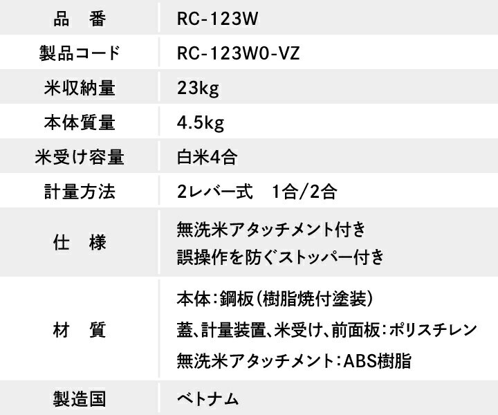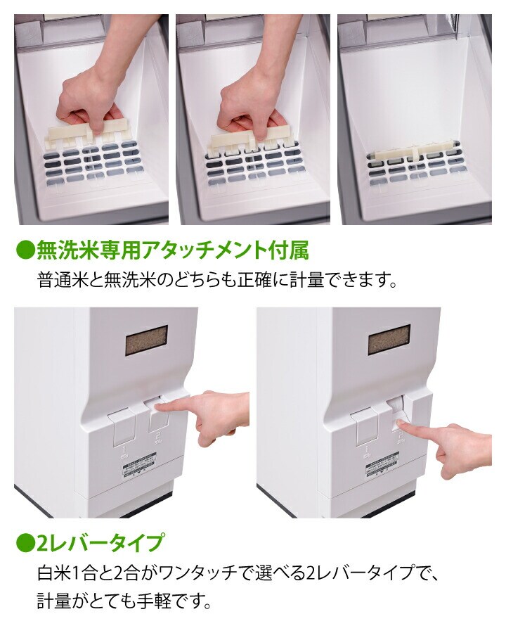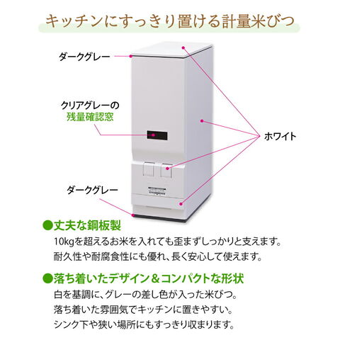 レバー部や米受け皿取手を、本体と一体化させた飽きのこないシンプルなデザイン。 置き場所を選ばず、隙間に収まるスリムな米びつです。 ●お米の収納量は約23kg。米受け皿には最大で約4合まで入ります。 ●本体は丈夫な鋼板製で、10kgを超えるお米を入れても歪まず しっかりと支えます。耐久性や耐腐食性にも優れ、長く安心して使えます。 ●白を基調にグレーを差し色として取り入れることで、キッチンに置きやすく 落ち着いた雰囲気を演出します。 ●コンパクトな形状なので、シンク下や狭い場所にもすっきり収まります。 ●白米1合と2合がワンタッチで選べる2レバータイプで、計量がとても手軽です。 ●無洗米が計れるワンタッチ着脱アタッチメント付き。 アタッチメントの着脱で、普通米でも無洗米でも計量できます。 ●米受け部分にはストッパーが付いており、 お子様のいたずらや誤操作をしっかりガードします。 |