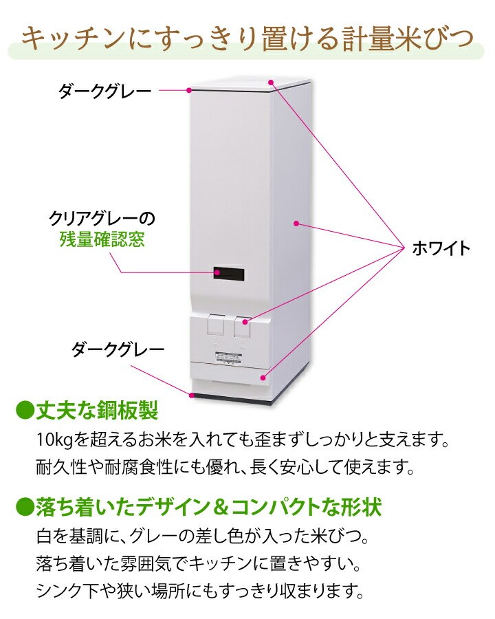 ●本体は丈夫な鋼板製で、10kgを超えるお米を入れても歪まず
