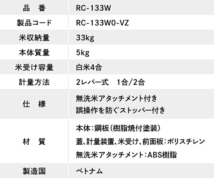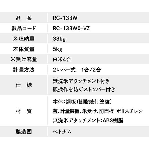 30kg 30キロ 30kg 33キロ 33kg レバー 1合分 2合分 1合 2合 米受け 4合 ストッパー いたずら防止 安心 安全 米 お米 白米 普通米 無洗米 保管 保存 米櫃 こめびつ ライスストッカー 家庭用 シンク下 隙間 スリム コンパクト 省スペース 幅21cm 幅210mm 奥行38.5cm 奥行385mm 高さ79cm 高さ790mm 残量 確認窓 鋼板 耐久性 インテリア ホワイトキッチン シンプル モダン キッチン 収納 収納用品 オシャレ 便利 計量 量る シンプル おしゃれ オシャレ お洒落 スタイリッシュ モダン デザイン 白 ホワイト RC133 RC-133W0-VZ RC133W0VZ 送料無料 MK精工 エムケー