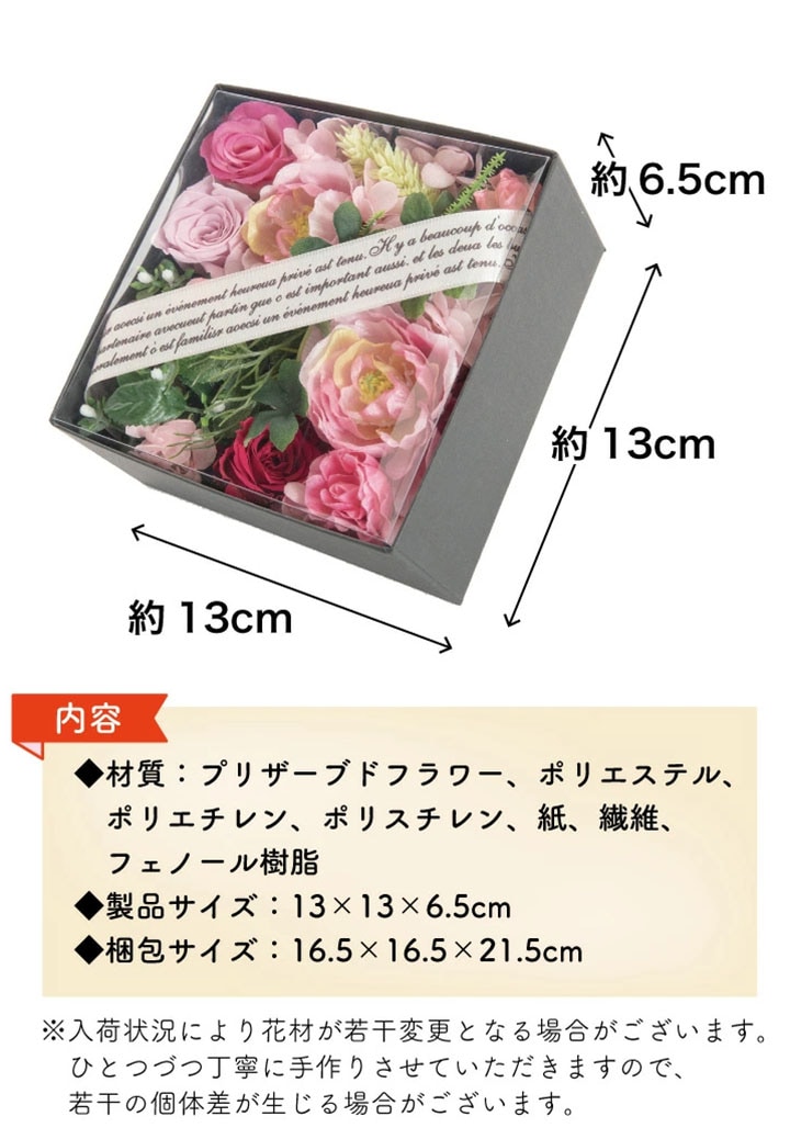 ●届いたらそのまま飾れるフラワーボックス。 ●ローズやラナンキュラスで埋め尽くし、お洒落なリボンがアクセント。 ●そのまま飾るだけでお部屋が明るく。 ●様々な場所に飾りやすいサイズです。 ●プリザーブドフラワーと造花なので 水やりや特殊なお手入れの必要はありません。 ●長期間、美しいお花をお楽しみいただけます。 ●メッセージカード付き。 ●日本製。 |