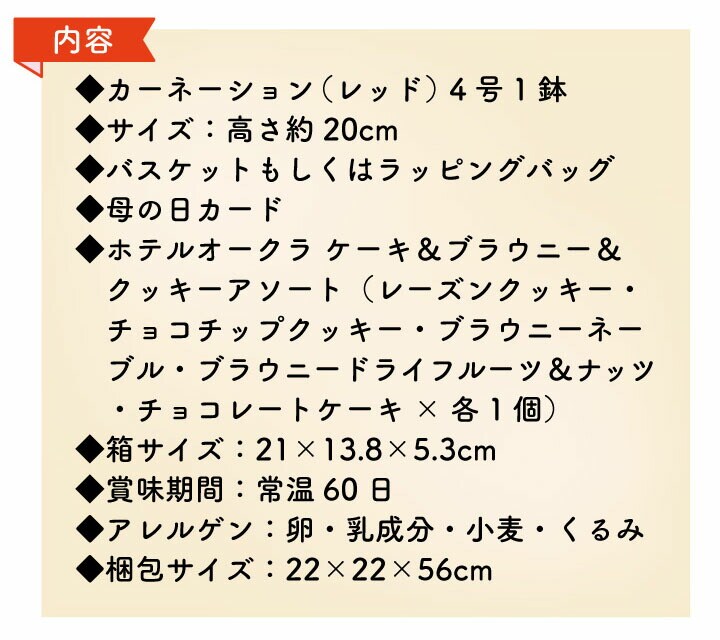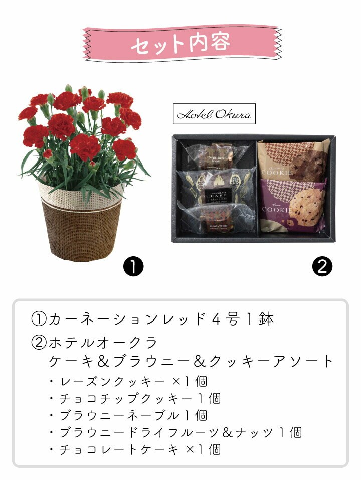●カーネーション(レッド)4号 1鉢 ●ホテルオークラ ケーキ&ブラウニー&クッキーアソート セット (レーズンクッキー・チョコチップクッキー・ブラウニーネーブル・ ブラウニードライフルーツ&ナッツ・チョコレートケーキ×各1個) |
