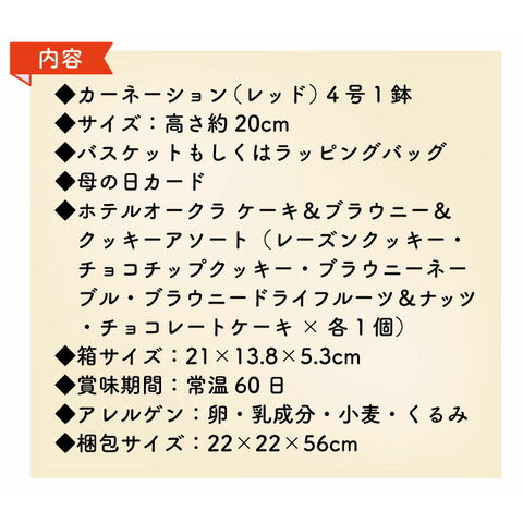 ●母の日定番のカーネーションとホテルーオークラ焼菓子詰め合わせのセット! ●名門ホテルの確かな技術とおもてなしの心が詰まった贅沢なスイーツです。 ●チョコレートのほろ苦さを凝縮したブラウニーをはじめ、 様々な焼菓子の詰合わせで、選ぶ・味わう楽しさを感じていただけます。 ●レッドカーネーションの鉢植えは愛知県産。 カーネーションの花言葉は母への愛! ●メッセージカード付き。 |