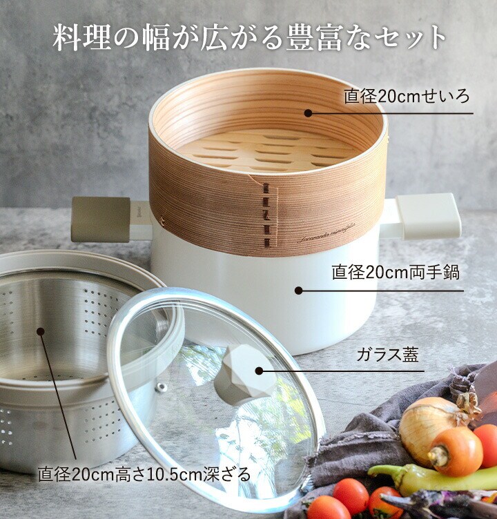 蒸し器 せいろ 20cm 20センチ 20センチ せいろ付き 蒸篭付き 蒸籠付き セイロ付き 蒸し鍋 スチーム 蒸気 蒸す なべ ハンドル 取っ手 蓋 フタ 直火 コンロ ガスコンロ IH ih 竹製 天然木 木 木製 丈夫 耐久性 調理 調理器具 調理グッズ 調理用品 キッチングッズ キッチン用品 料理 キッチン 台所 ダイニング 食卓 食事 ごはん 簡単 便利 便利グッズ 健康 ヘルシー ふっくら ふんわり 柔らかい やわらかい しっとり パサパサしない パサつかない 美味しい おいしい 食材 素材 味 うまみ うま味 旨味 ふうみ 風味 香り かおり 栄養 逃がさない 失われない とじこめる そのまま 野菜 肉 魚 点心 飲茶 小籠包 焼売 シュウマイ しゅうまい 中華まん 肉まん あんまん 温野菜 蒸し野菜 蒸しパン 茶碗蒸し 冷凍 冷凍食品 冷凍ご飯 解凍 温め あたため 再加熱 中華 和食 スープ 汁 ミルク 牛乳 おかず 献立 シンプル おしゃれ オシャレ プレゼント ギフト 贈り物 お祝い お返し 結婚祝い 新築祝い 引っ越し祝い 内祝い ラッピング無料 包装無料 送料無料 白 グレー 灰色 KUKUNA ククナ KITCHEN apide アピデ