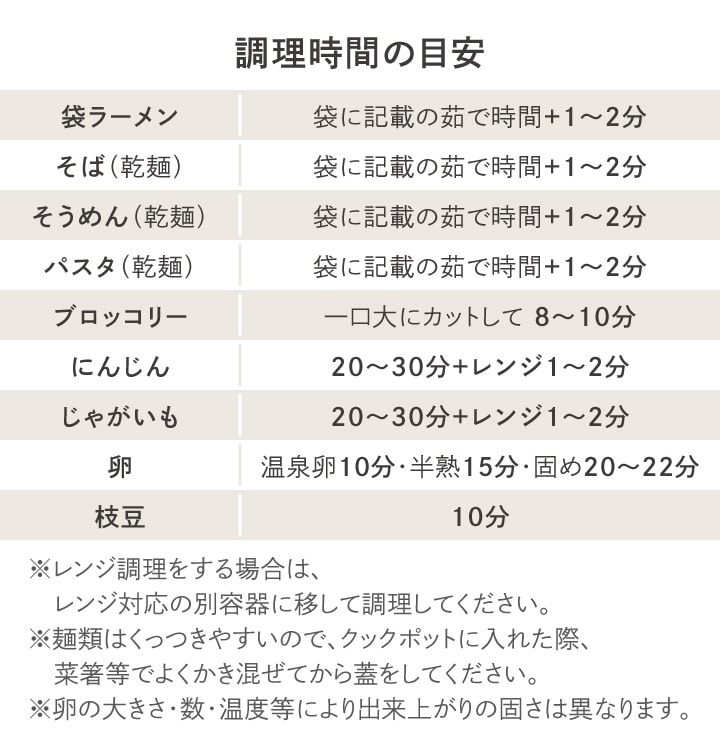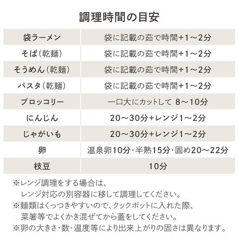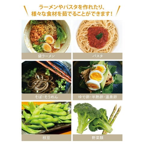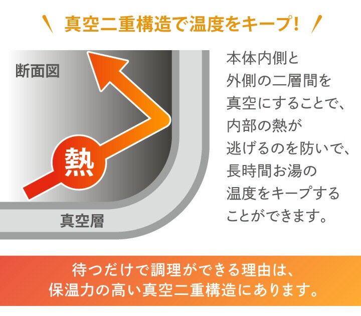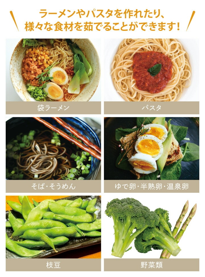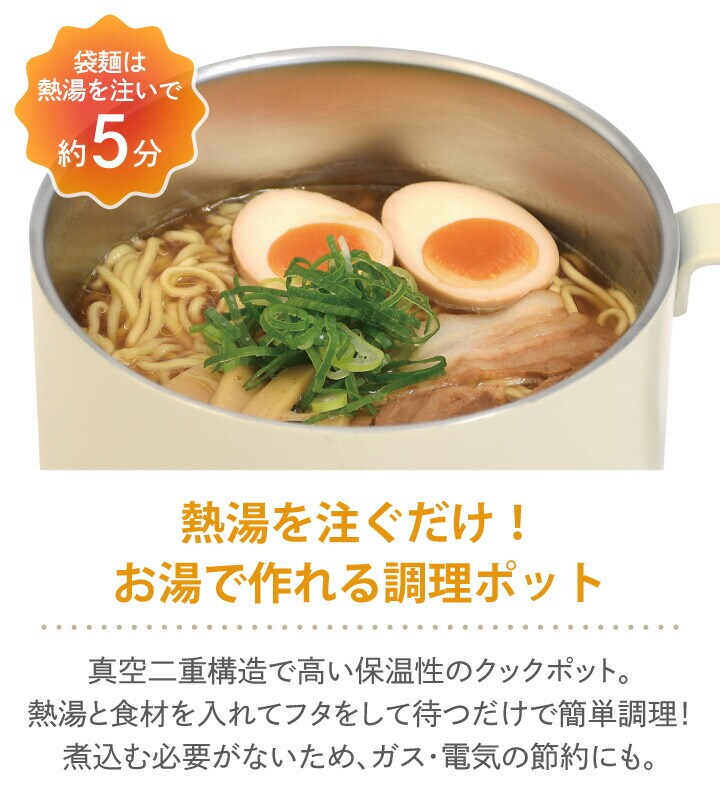 ●熱湯を注ぐだけの、簡単調理ポットです♪ 忙しい時でも、お湯を注いだ後はほったらかしでOK! ●待つだけの簡単調理のヒミツは、保温力の高い真空二重構造。 ●袋麺は熱湯を注いで約5分でできます! ●温泉たまご、半熟・硬めのゆでたまごもお湯を注ぐだけ。 ●キッチンに馴染むおしゃれなカラーバリエーション。 |