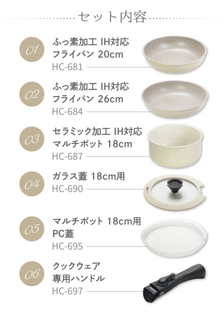 ・ふっ素加工 IH対応フライパン20cm(HC-681)…1個 ・ふっ素加工 IH対応フライパン26cm(HC-684)…1個 ・セラミック加工 IH対応マルチポット18cm(HC-687)…1個 ・ガラス蓋18cm用(HC-690)…1個 ・マルチポット18cm用PC蓋(HC-695)…1個 ・クックウェア専用ハンドル(HC-697)…1個 |